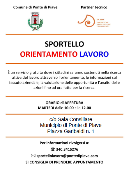 SI INFORMA CHE LA SEDE DELLO SPORTELLO ORIENTAMENTO LAVORO E’ STATA SPOSTATA PRESSO LA SALA CONSILIARE DEL MUNICIPIO DI PONTE DI PIAVE