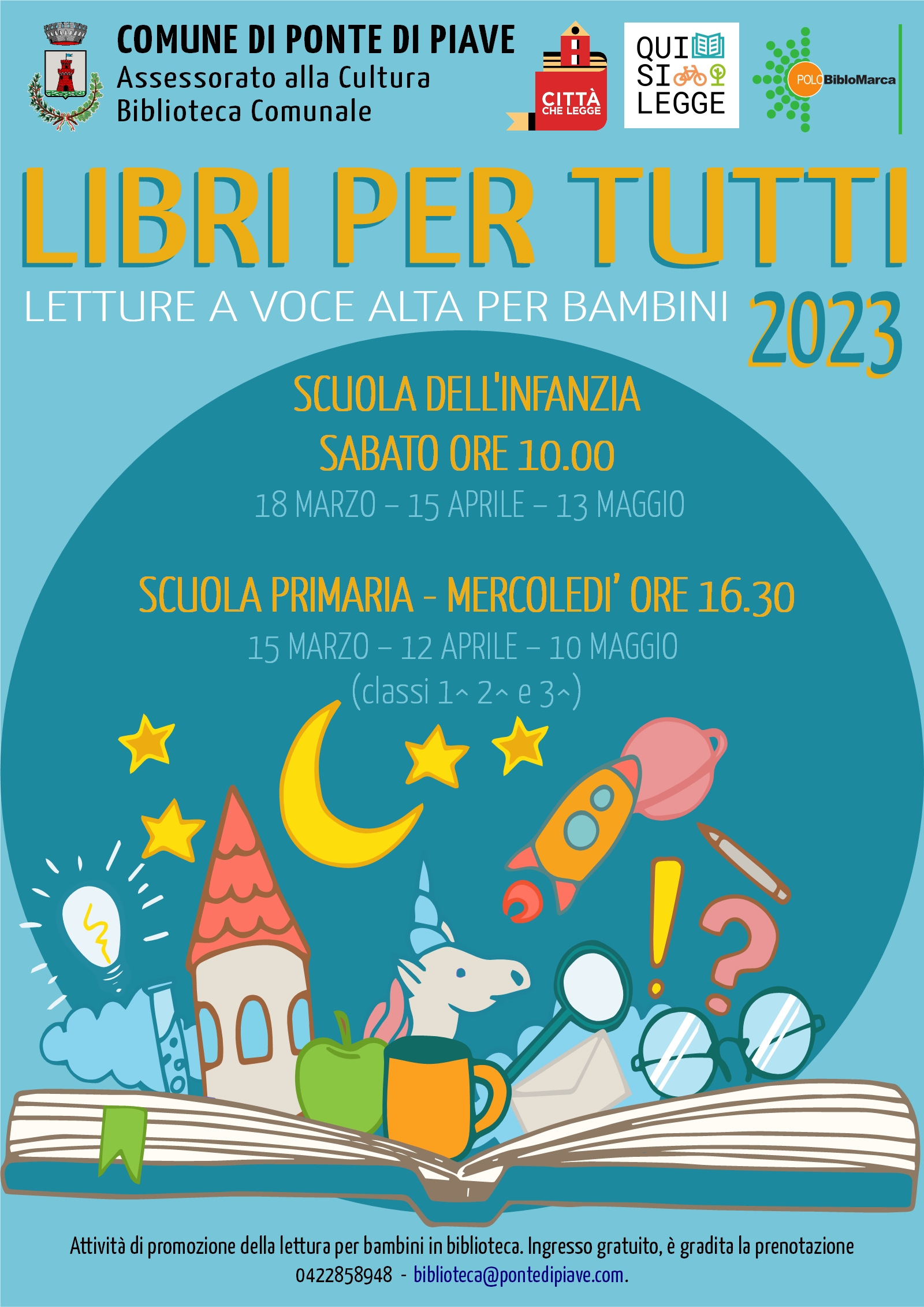Le letture sono a ingresso libero. E' gradita la prenotazione al n. 0422858948 o all'indirizzo biblioteca@pontedipiave.com