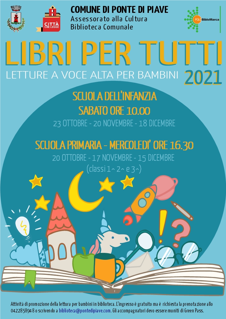 Si svolgeranno sabato 23 ottobre, 20 novembre e 18 dicembre alle ore 10.00 per i bambini della scuola dell'infanzia, mentre per i bambini della scuola primaria (classi 1^, 2^ e 3^) mercoledì 20 ottobre, 17 novembre e 15 dicembre alle 16.30. L’ingresso è gratuito ma è richiesta la prenotazione allo 0422858948 o scrivendo a biblioteca@pontedipiave.com. Gli accompagnatori devo essere muniti di Green Pass.