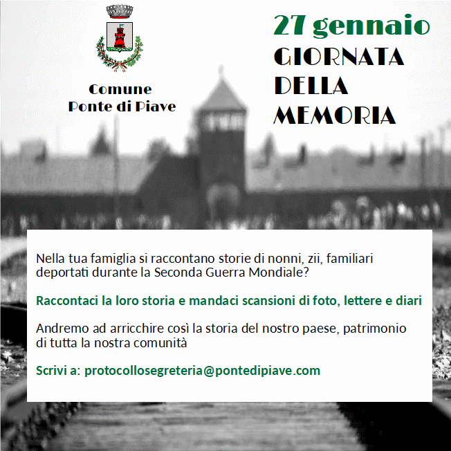 Quest’anno il contesto pandemico non ci permette di ritrovarci insieme ma proprio per non dimenticare, l’Amministrazione comunale invita ognuno di Voi a dare il proprio contributo attraverso la divulgazione di racconti, storie, documenti o fotografie di familiari che hanno vissuto in prima persona questa tragica pagina della storia dell’umanità.