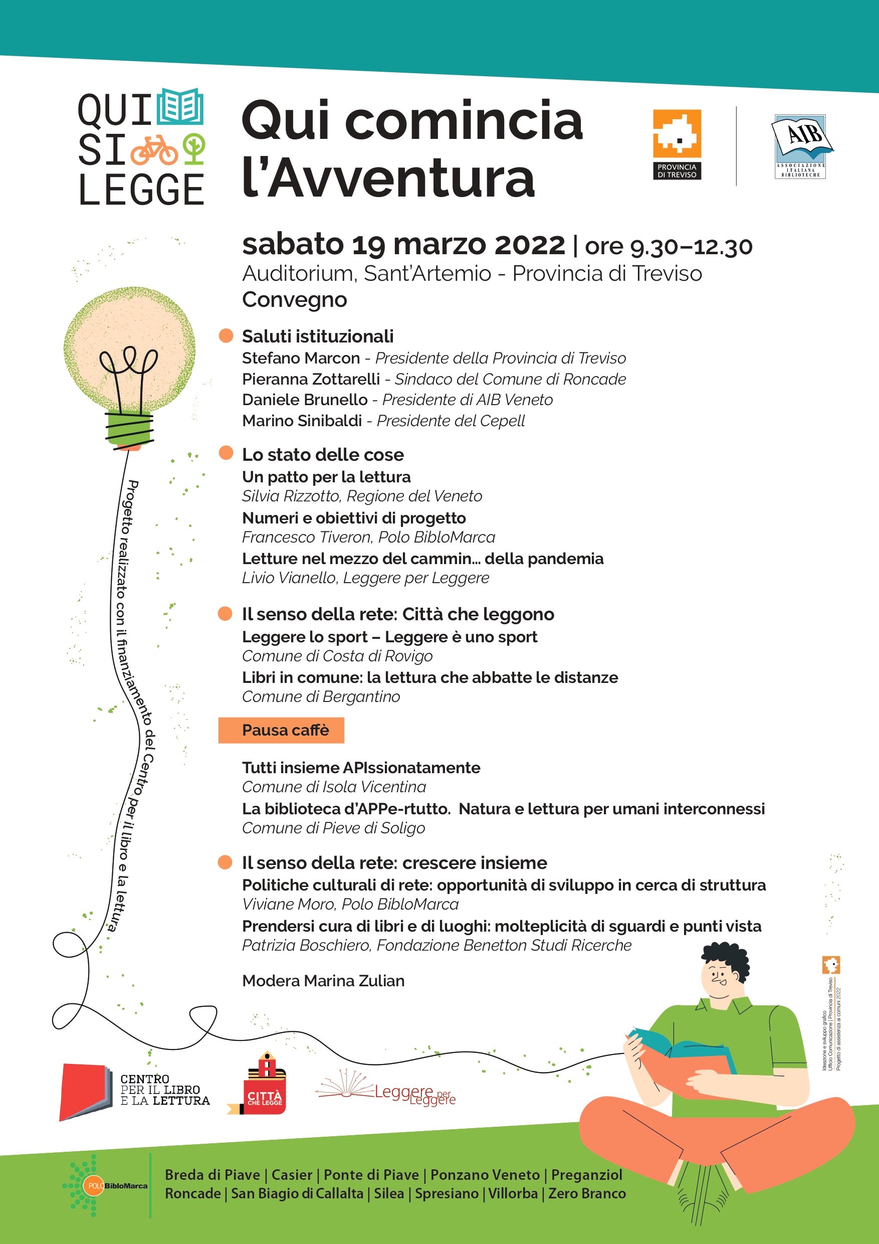 Sabato 19 marzo 2022, dalle 9.30 alle 12.30, si terrà a Treviso, presso l’Auditorium Sant’Artemio della Provincia, "Qui comincia l’Avventura", convegno di presentazione del progetto "Qui si legge. Sei promemoria per la lettura che verrà", risultato vincitore del bando nazionale Città che Legge 2020.