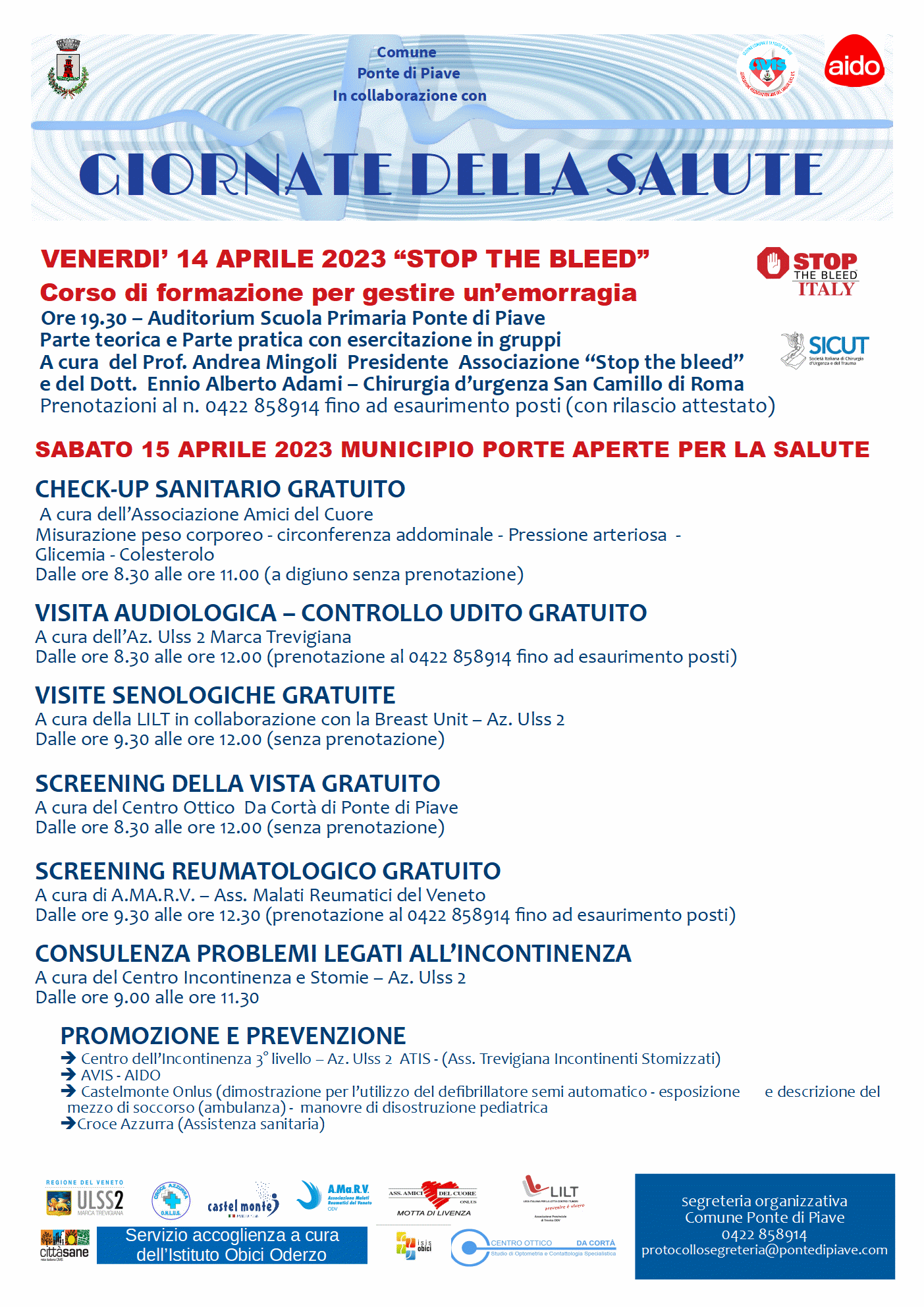 Nella piazza antistante il Municipio si sono inoltre tenute attività di promozione e prevenzione a cura del Centro dell’Incontinenza 3° livello – Az. Ulss 2 e ATIS (Ass. Trevigiana Incontinenti Stomizzati), di AVIS – AIDO, di Castelmonte Onlus e Croce Azzurra.