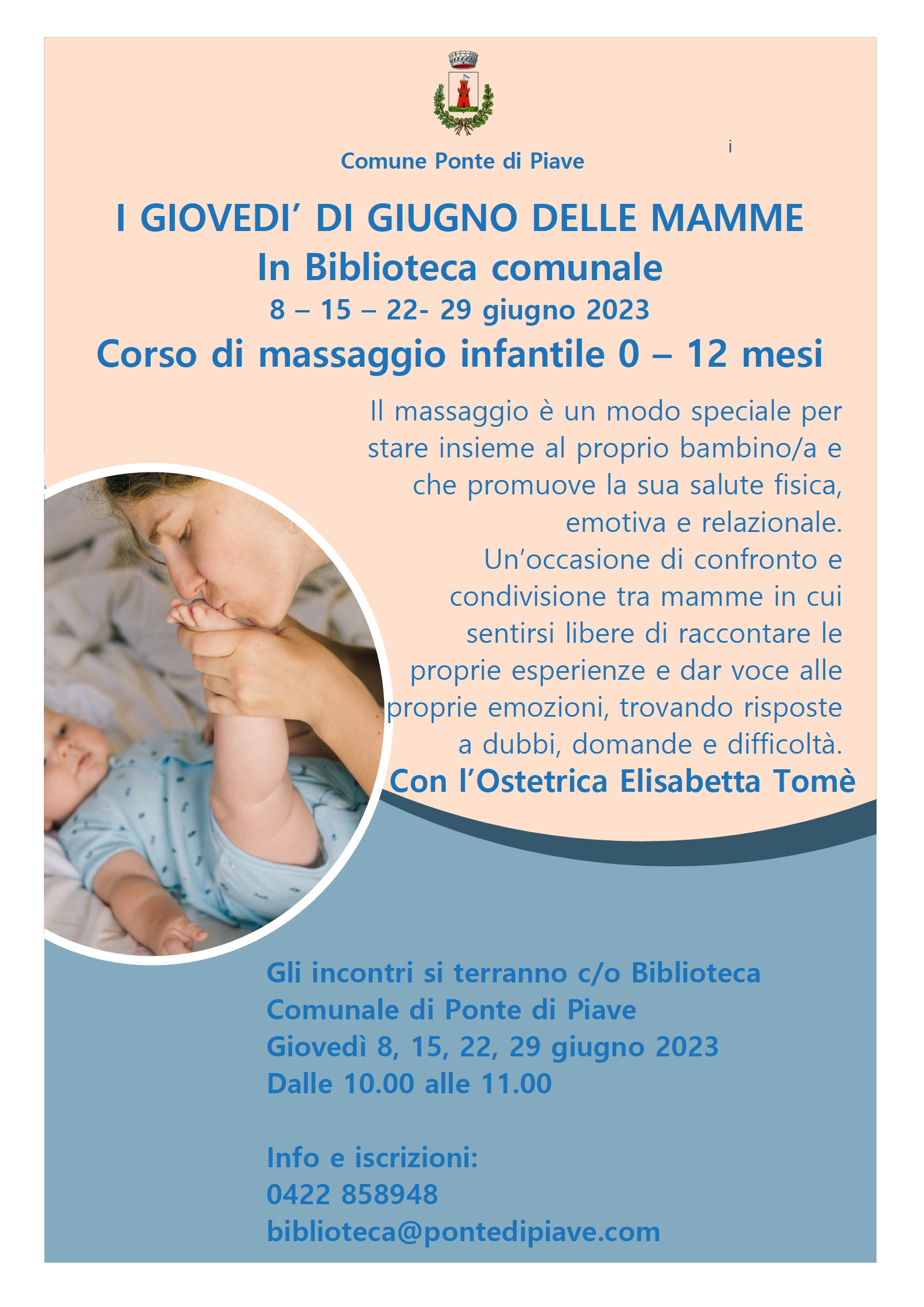Il Comune di Ponte di Piave si pone al fianco delle neo-mamme con un corso di massaggio infantile 0-12 mesi a loro dedicato nel mese di giugno, il giovedì mattina, con la collaborazione dell'ostetrica Elisabetta Tomè.